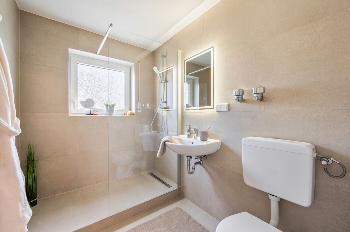 Das Badezimmer präsentiert sich in einem zeitgemäßen, hochwertigen Design und entspricht in Ausstattung und Optik aktuellen Wohnstandards.