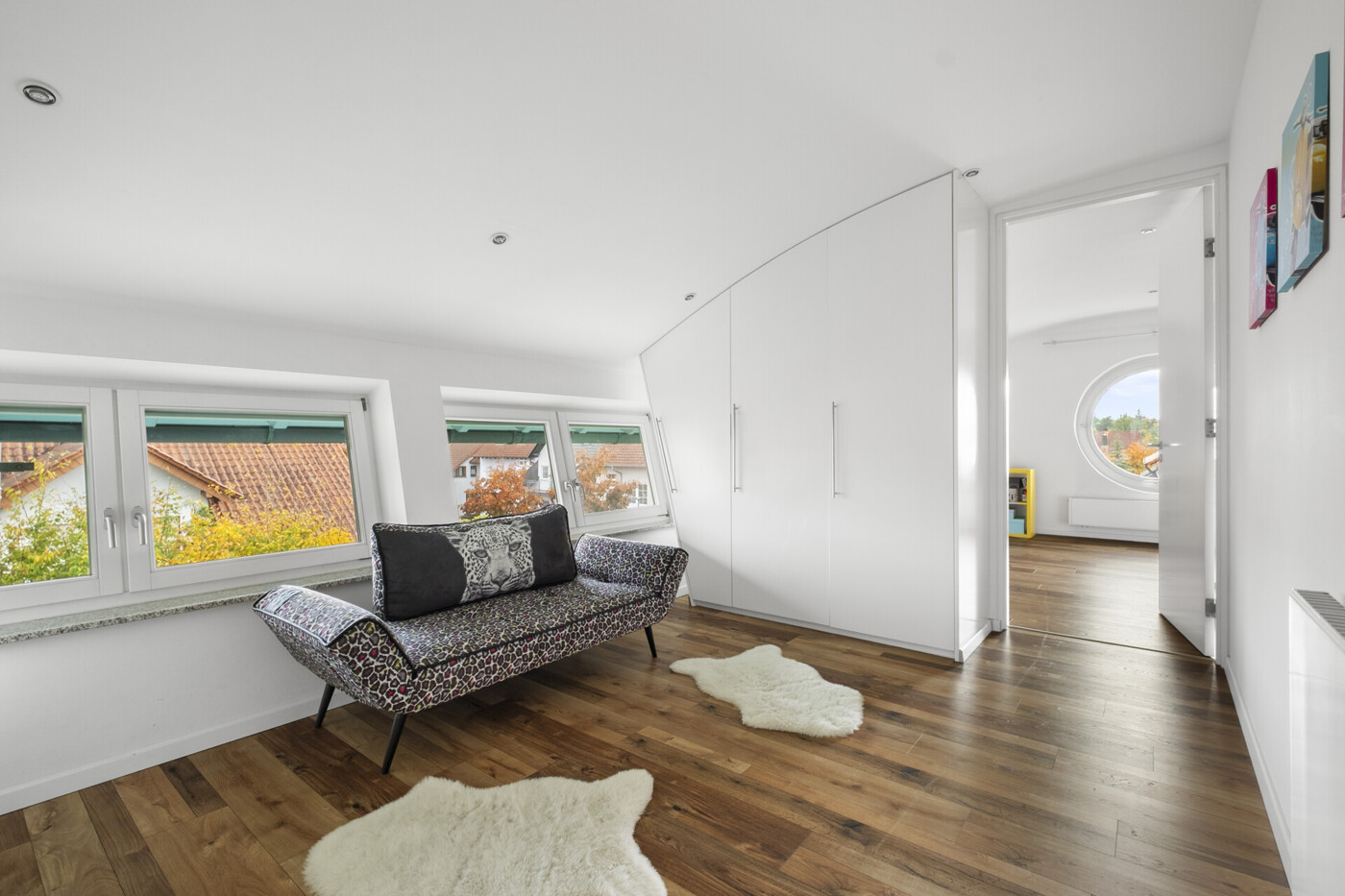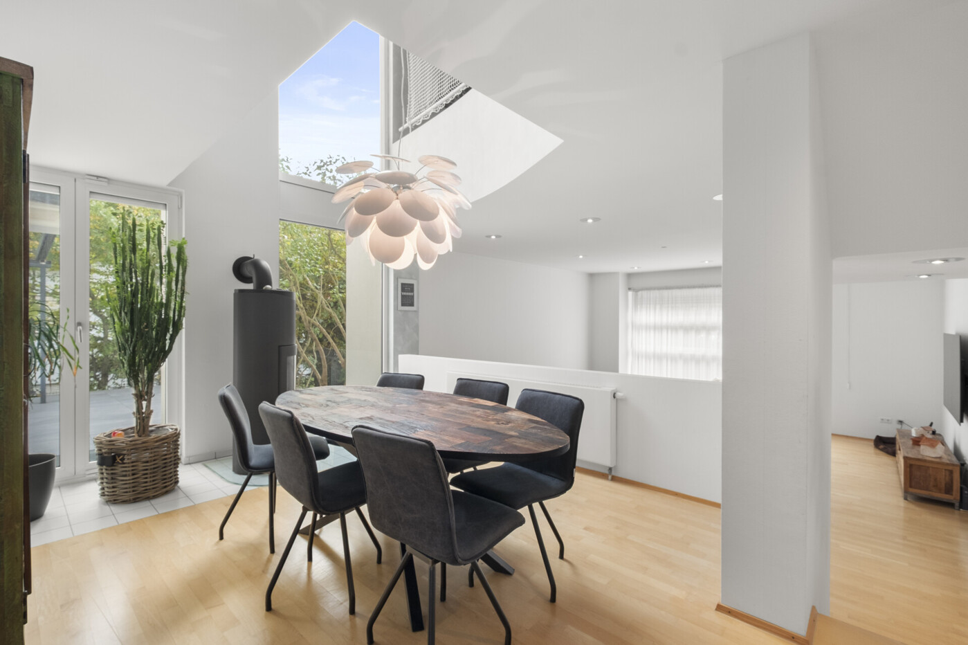 Neun lichtdurchflutete Zimmer, darunter vier elegante Schlafzimmer und zwei moderne Badezimmer, schaffen ein Ambiente voller Großzügigkeit und Behaglichkeit. Jede Etage überzeugt mit architektonischem Feingefühl, hochwertigen Materialien und durchdachten Details, die den gehobenen Anspruch dieses Anwesens unterstreichen.