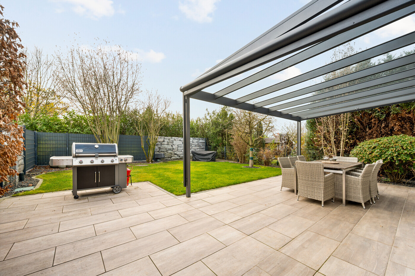 Ein echtes Highlight ist der Außenbereich: Die erneuerte Terrasse mit eleganter Glasüberdachung schafft einen geschützten Lieblingsplatz für gemeinsame Abende, während der gepflegte Garten – ausgestattet mit Bewässerung, Beleuchtung und Brunnen – wie eine kleine Wohlfühloase wirkt. Hier lässt sich der Alltag einfach hinter sich lassen.