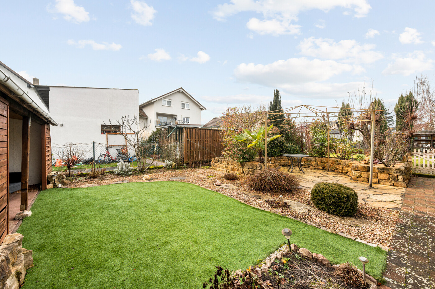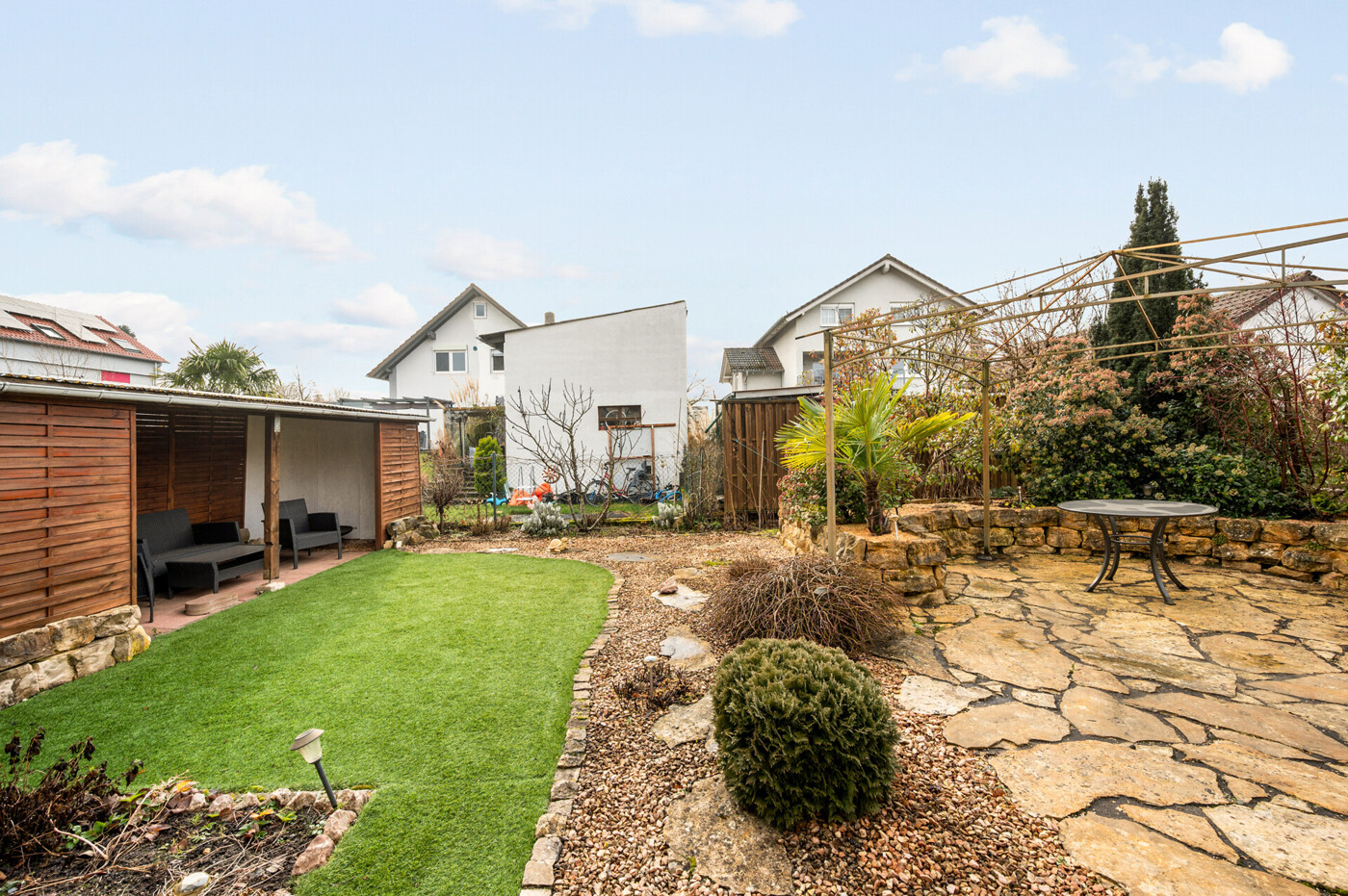 Der liebevoll angelegte Garten im mediterranen Stil rundet das Gesamtbild ab und schafft eine private Wohlfühloase.